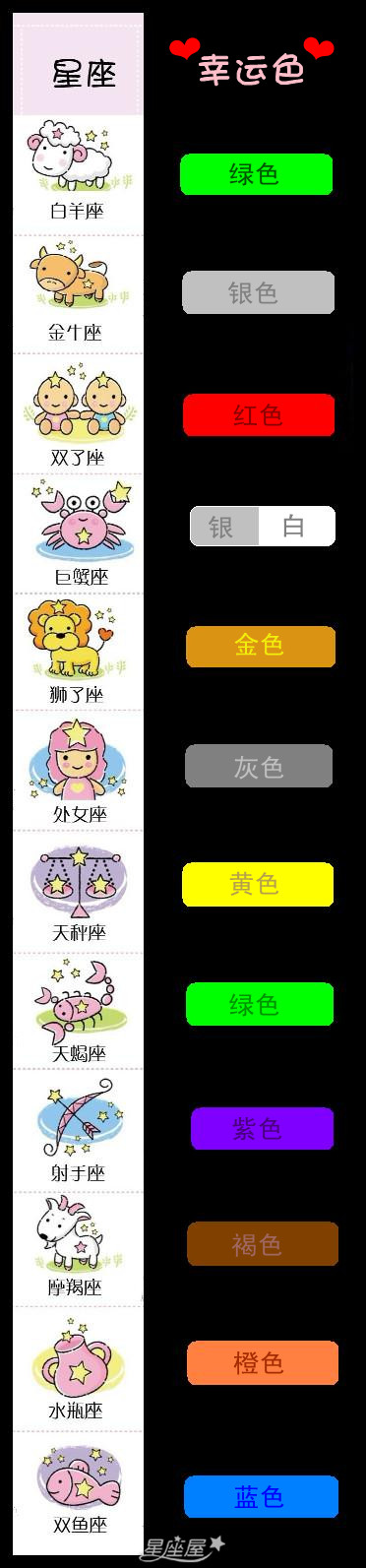 【导语】生活处处充满着色彩,不同的颜色代表着不同的意义,不同的颜色也可以代表着不同的性格特点,当然不同的颜色还可以代表着人的不同情感。 颜色和情感有很大的联系,彼此都可以变化多端,人可以因为情感的变化而选择变换颜色,而看到不同的颜色,更会产生不同的情感变化。 今天你选对了颜色了吗?你的幸运色是什么?星座屋在此说说,2012年星座运势预测幸运色,看你最近的幸运色。