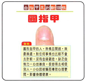 圆形指甲的人,热情且开朗,无忧无虑,对任何事情也比较不会去计较。没有金钱观念,缺乏自制力,心地善良,很容易去相信别人,小心因被骗而导致心理郁闷,影响身体健康。