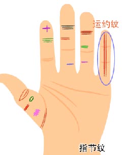 笫一、二、三节上有一条或二条贯穿三节的「直纹」的人,也称为「运约纹」,代表老年时期福寿双全,子孙贤孝,富贵荣华,而且是年纪越大运势越旺,子女事业有成。