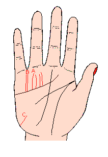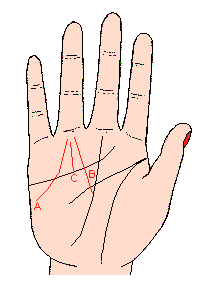 (记号A)感情线上伸出几条不规则、浅而细又薄的太阳线,表示心理向多方面活动,并无一贯方针,这便是多才多艺反遭穷困的相,不过如果从事于公关行业的话,则可八面玲珑,博得广大人缘。