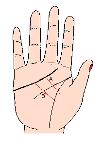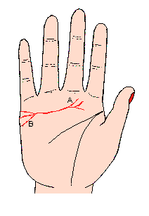感情线分支的线,长伸下垂与生命线相切(记号A),主心理不稳定,幼年于一个不愉快的家庭长大,长期悲观及消极;亦表示一生有难忘的恋情,而其时期可由此线与生命线相切的那一点,以生命线之流年来计算.有此线的人,表示第一次的恋人,不可能成为终身伴侣,即只有恋爱而无法结合。如与生命线相切的感情线上的某处有岛屿,即表示有不正常的三角关系(记号B),即表示有色情的勾当。