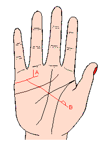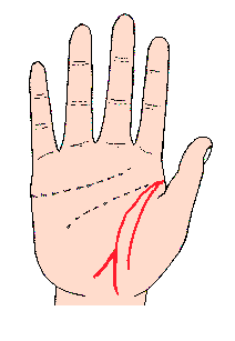 由婚姻线尖端所出来的短线向上延伸,直到太阳丘(记号A),表示将与名门或资产家结婚,因而得到幸福。