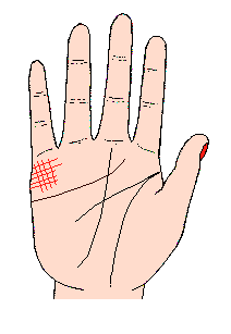 好几条结合线与好几条竖线相交叉成为格子形,表示现在过着单身生活,距离姻缘决定尚须一段时间,纵然他有意中人,还是不能马上结婚,究竟会在几岁结婚?要运用命运线的流年法,才能知道其年时,至于判断目前进行中,亲事的好坏,则须仔细观察命运线,感情线,智能线等情况,才能知道;出自月丘或金星丘的线碰到命运线的点,表示婚期;“感情线或结婚线出现淡红色,表示婚期即将届临”。