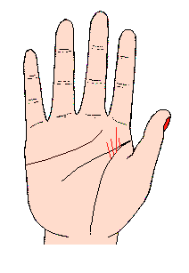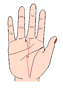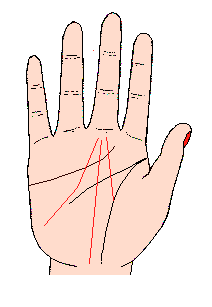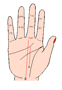 离开生命线,在手掌中央分出的命运线,(记号A)意味幼年时代深受父母的宠爱,过着很舒服的生活;假如此线短或消失于手掌的中央,即表示父母破产或遭遇其它不幸的事情,以致无法再得到父母的疵荫。