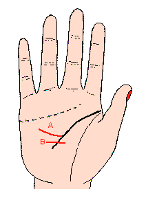 命运线的一部份在生命线上,另一条命运线从手腕的中央伸起,(记号B)主这些人受父母恩泽而外,能发自己的力量奋斗努力;大多数大学毕业后,自食其力以建立家庭。