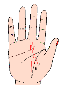 命运线起自金星丘,表示靠异性或亲属的提拔来开运(记号B),但此线短得达不到头脑线,即使受了其恩惠,也只有一时的;如此线下端有岛纹,(记号A)表示与较自己有钱,或有才能或有地位的人同居,虽然可享受快乐的物质生活,但两人之间的关系不正常。命运线起于生命线下部,(记号C)主少年时代父母穷困或无依靠,必须靠自己的努力奋斗,去开拓命运,靠自己的努力而白手兴家。
