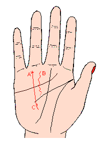 财运线断断续续(记号C)或曲曲折折的(记号B),表示金钱运较差,这时候受到生活困难的威胁或生意不顺当,内心至焦急不安,如有这般情形,应尽量忍耐,不必再予投资,力求消极以渡过难关。