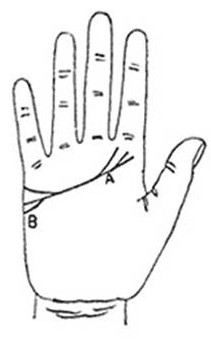 感情线向上另有支线,虽然很短也是表示爱情的萌芽。从出现了支线开始,表示有情人出现(A)。爱情线的起点有二、三条如图那样的支线(B),假如完全没有这样线相,则表示朴素、单调、不会应酬的人。这种线相越明显的人,越善于交际,有幽默感,爱热闹,有自娱娱人的本事。手很柔的人常常会看到这种线相,但从事粗活劳力的人,这种线相却容易被隐蔽起来而看不出。这种线相乃表示文学上的表现力,或创造幽默气氛的才能,也称为幽默线。