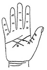 由感情分出来的支线延长而切断生命线,就是表示遇到刻骨铭心终生难忘的恋爱,至于遇上的时间年龄就要看此线切断生命线的位置,依照生命线的流年来判定(A)。这种长支线多表示经过一时热恋,却不能发展成良缘。