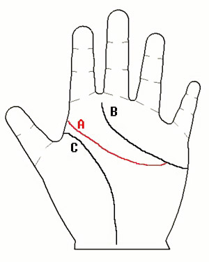 看看你的手,是否智慧线(A)和生命线(C)起点分开,智慧线尾端上翘和感情线(B)相接。男生有这种手相,将不会待在家乡,而会在外县市发展有成;有这手相的女生,可望因子而贵,生出大明星或者大老板都有可能。有这种手相的你,婚姻上可遇奇缘。