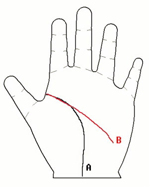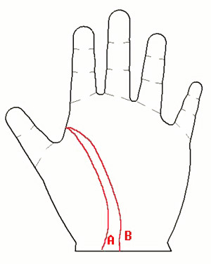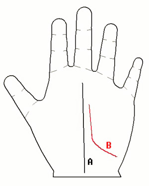 你是否有着长长的人缘线呢!若你的人缘线从手掌下部伸出(B),还顺着事业线(A)平行上升,照欧美手相术判断,有这种手相的你,可得异性帮助,或由恋爱、婚姻而得到意想不到的好运。