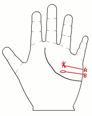 智慧线(B)和生命线(A)起点大幅度重合,常常能拥有现代灰姑娘式的恋爱,将因结婚而获得幸福。请仔细看看你的手,是否显示这个幸运记号!