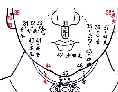 34、双生:为生双胞胎之相。一生多为体弱多病的儿女操心。子宫易有毛病,对健康运、夫妻运、财运,都是不好。
