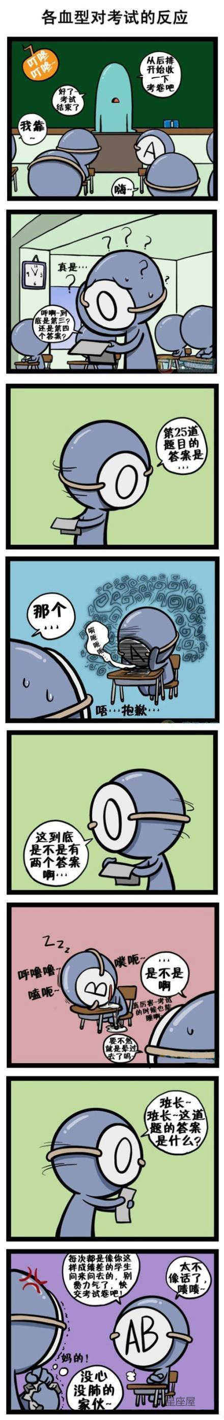 【漫画欣赏】各血型对考试的反应