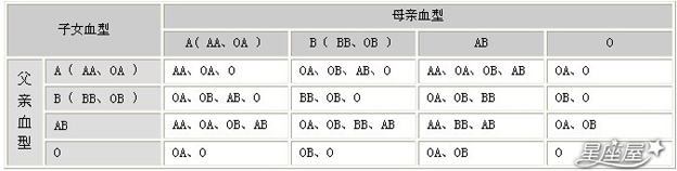 子女和父母的血型配合表