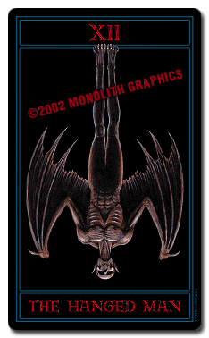 “倒吊人”,他用单脚倒吊在树上,虽然他看来有点无助,事实上,他掌管沉思和精神面的力量。因此,当牌面正立时,表示认清极限、解决问题和拥有人文特质。倒立则代表在精神上有所局限,并且缺乏远见。