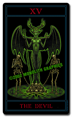 “恶魔”,由于受到强烈的性吸引、非理性与热情的影响,使这张牌呈现交错的恐惧与欲望。魔鬼利用人对安全和金鱼的需求,透过人性的矛盾,使人们成为他的奴隶。这张牌积极的一面代表了感官的魅力和热情的表达。但同时牌的反面也提醒我们即使肢体上受到束缚,精神上还是可以自由翱翔。