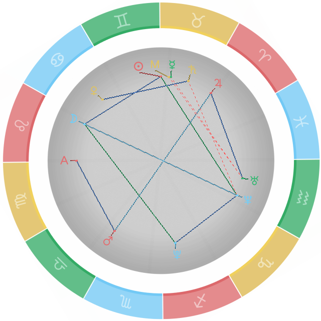 冲相位:又称为对分相,这是个凶相位,两颗行星与星盘圆心夹角为180度。