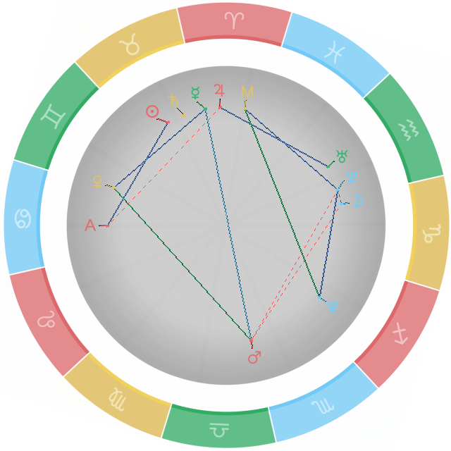 冲相位:又称为对分相,这是个凶相位,两颗行星与星盘圆心夹角为180度。