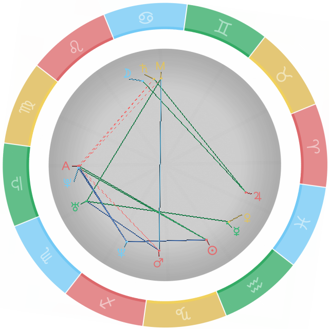 冲相位:又称为对分相,这是个凶相位,两颗行星与星盘圆心夹角为180度。