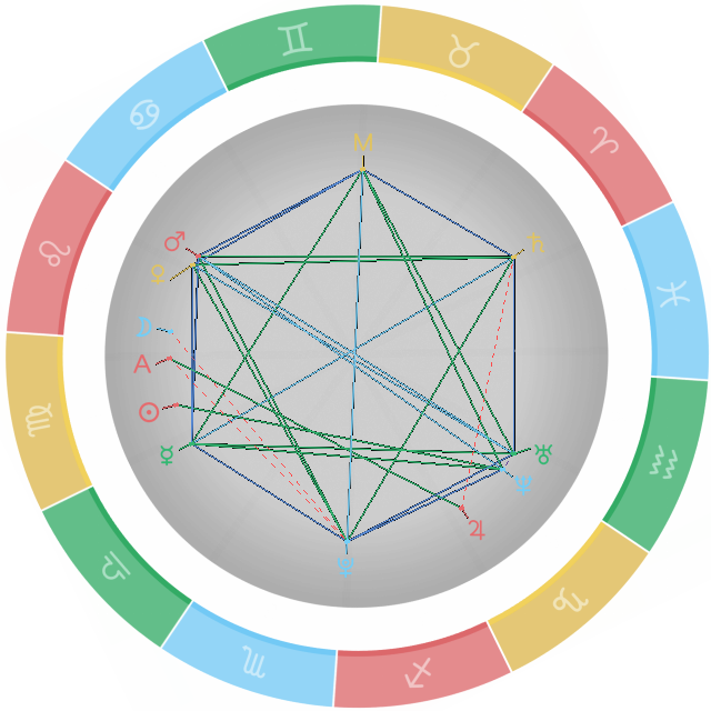 六合相位:又称六分相,这是个优良的相位,两颗行星与星盘圆心夹角为60度。
