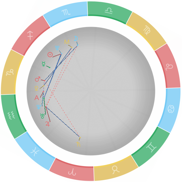 冲相位:又称为对分相,这是个凶相位,两颗行星与星盘圆心夹角为180度。