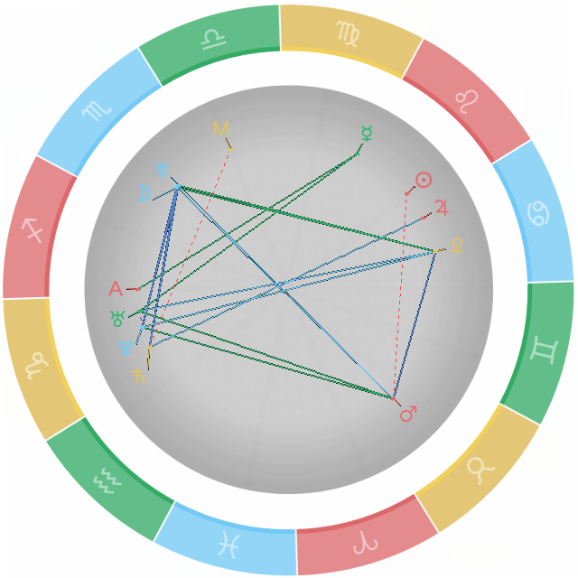 冲相位:又称为对分相,这是个凶相位,两颗行星与星盘圆心夹角为180度。